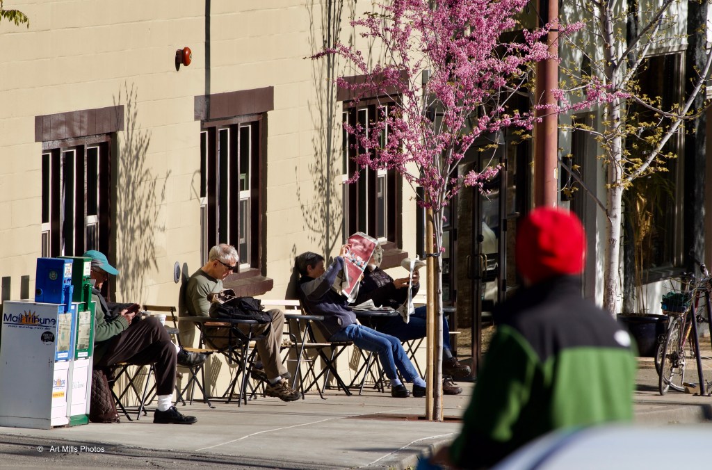 There are quiet “rebels” at a popular coffee house. The owners have conveniently left the usual chairs and tables out front for their “take out” customers.