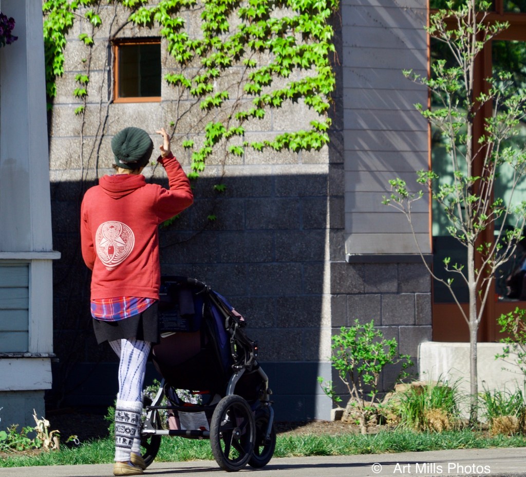 Just around the corner, a mother and her child are out for a walk…