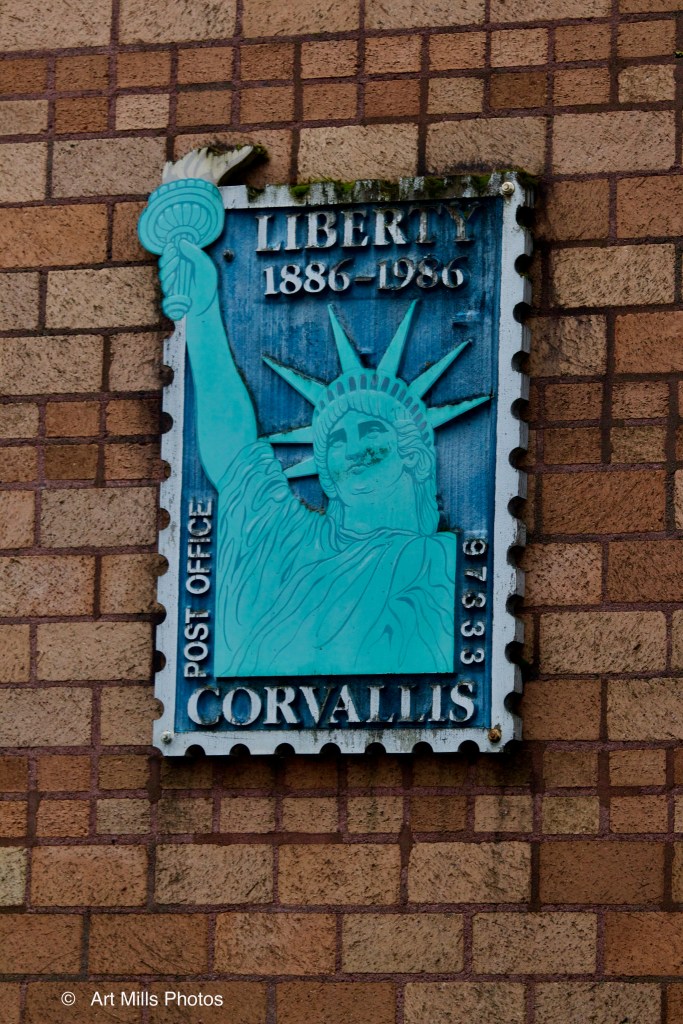 In downtown Corvallis, Oregon, the U.S. Post Office resides on land where the Willamette River flows nearby. By the entrance you see a 1986 postage stamp commemorating the 1886 raising of the Statue of Liberty in New York City.